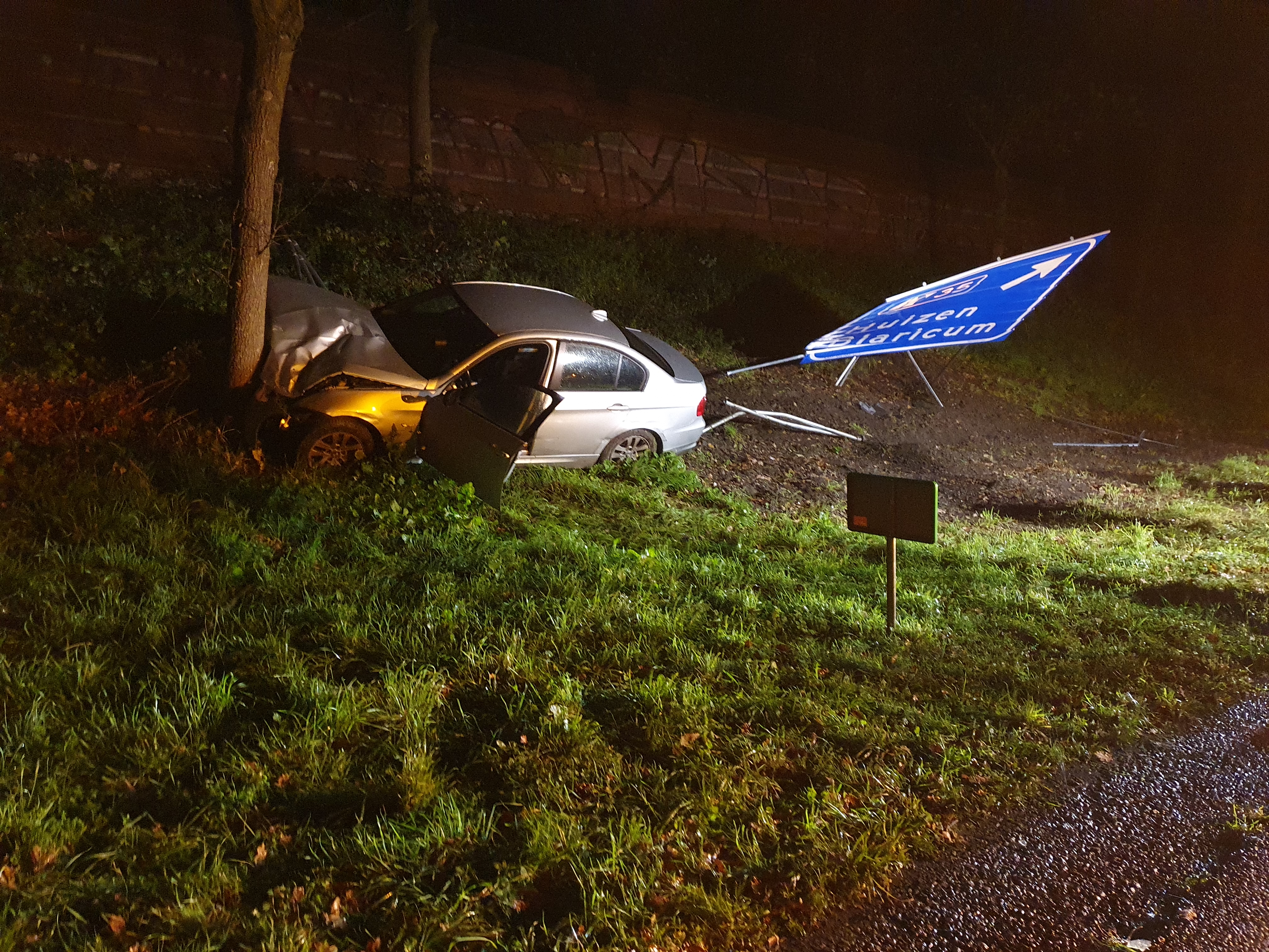 Zwaar ongeval op de N303 Voorthuizen. erg donker weg ter plaatse bleek het gelukkig alleen ernstige beschadigde BMW te zijn. ( Bestuurde erg ontdaan maar wel nuchter )dat scheelt een hoop ellende vd eigenaar Auto mist rechter achter wiel maar lag 30 meter verder in een kleine slootje auto op 3 pootjes gezet en veilig gesteld op vesteging Amersfoort