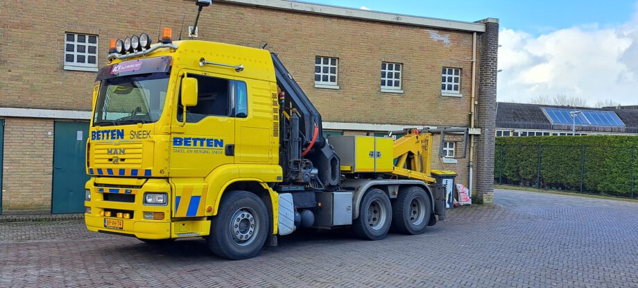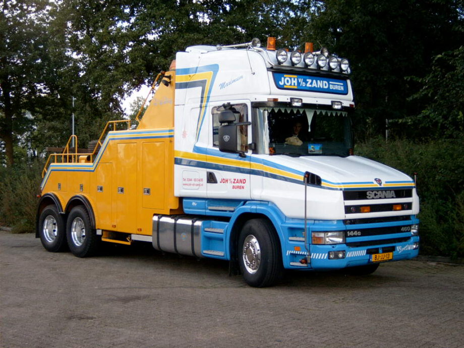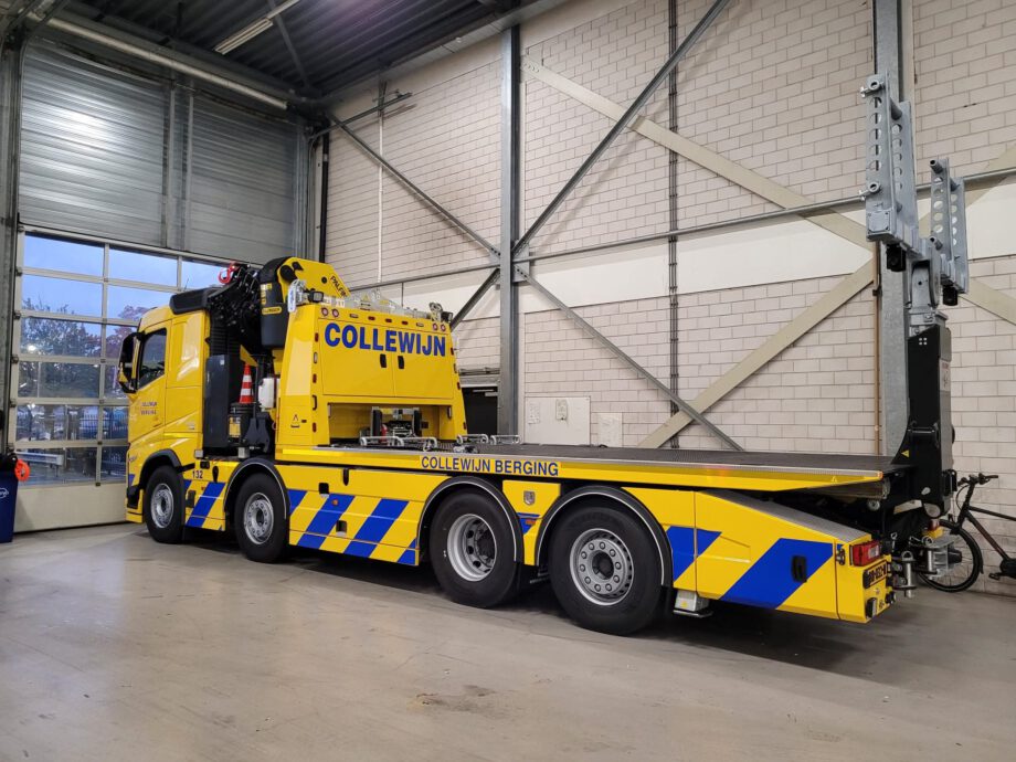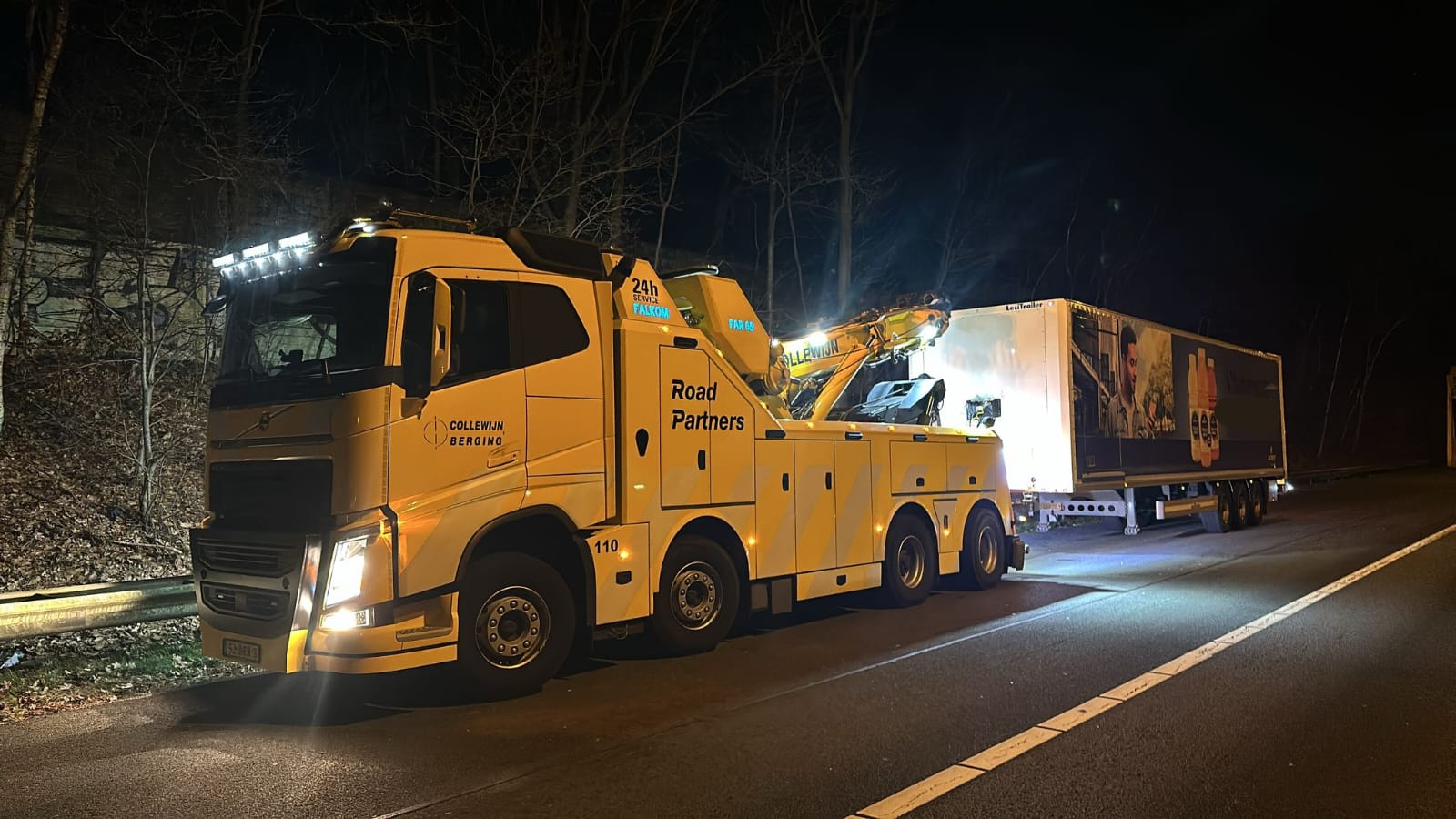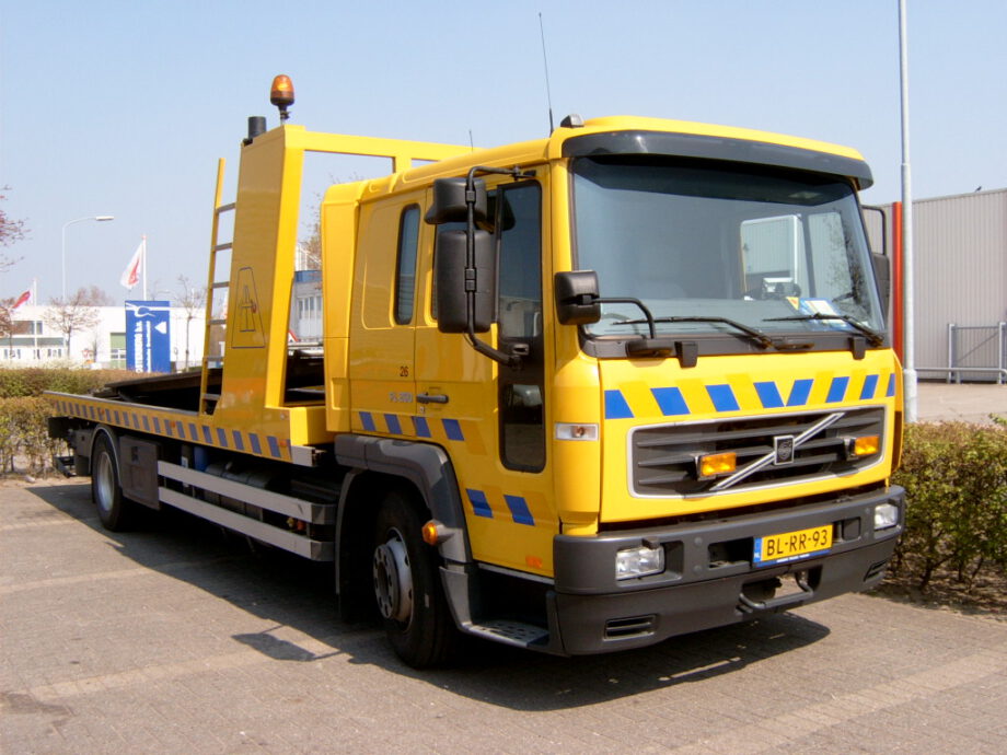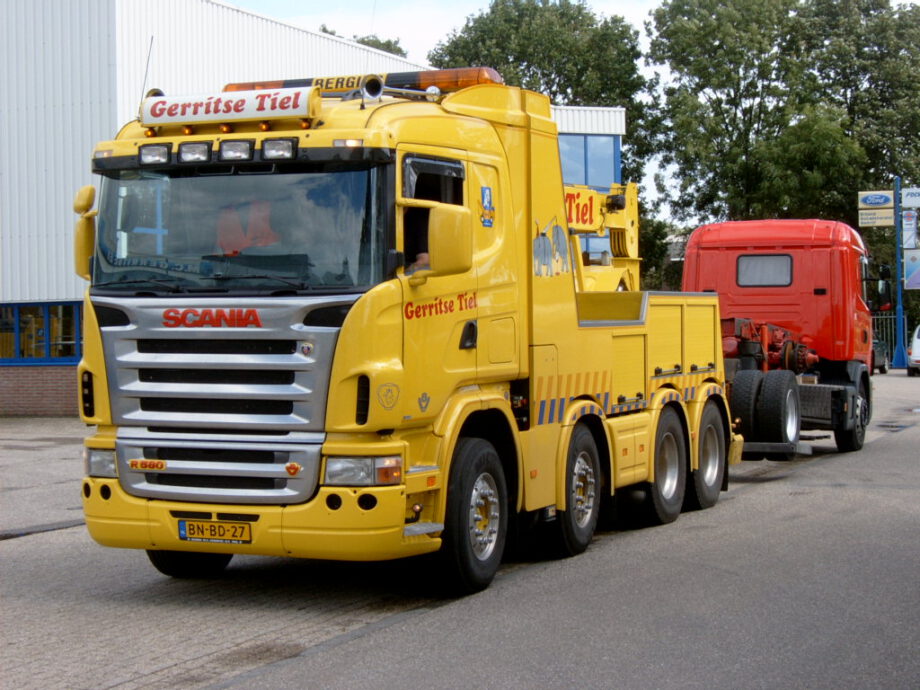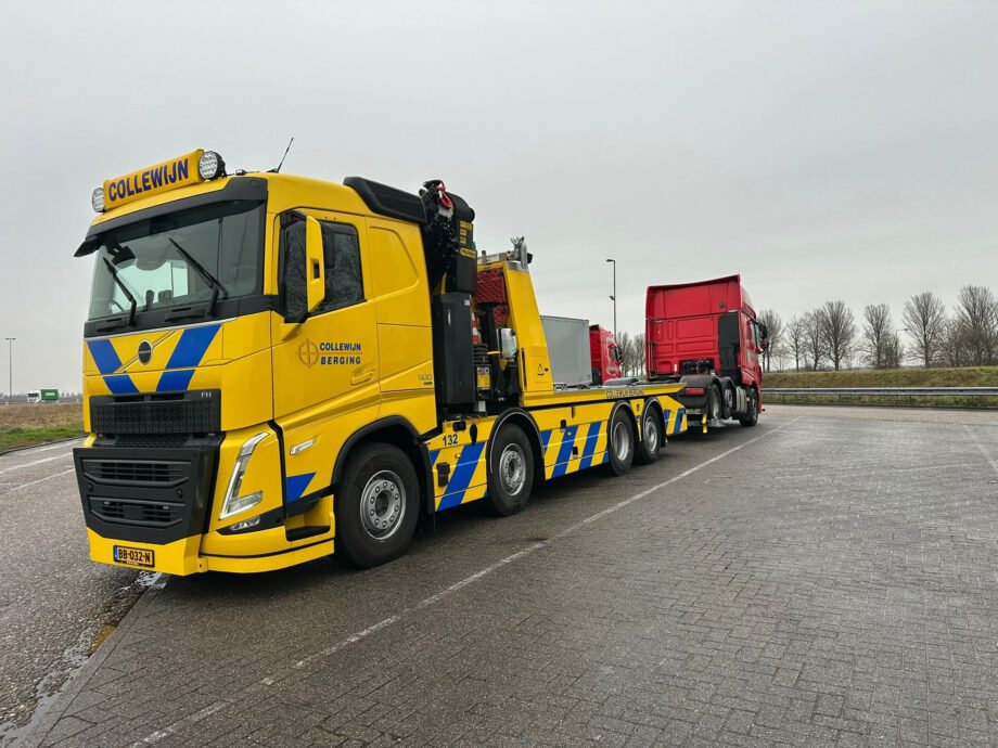 Vrachtwagen met pech wordt naar garage Scania gebracht door collewijn,,