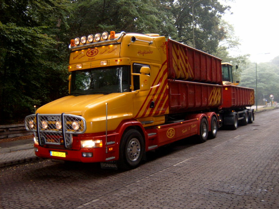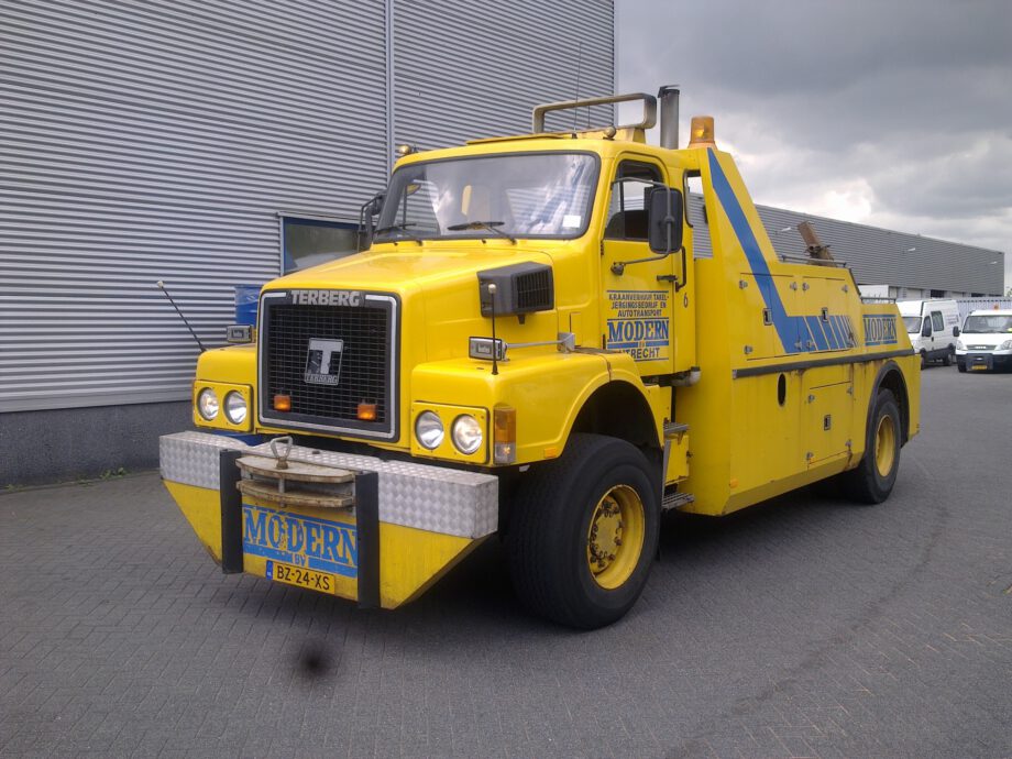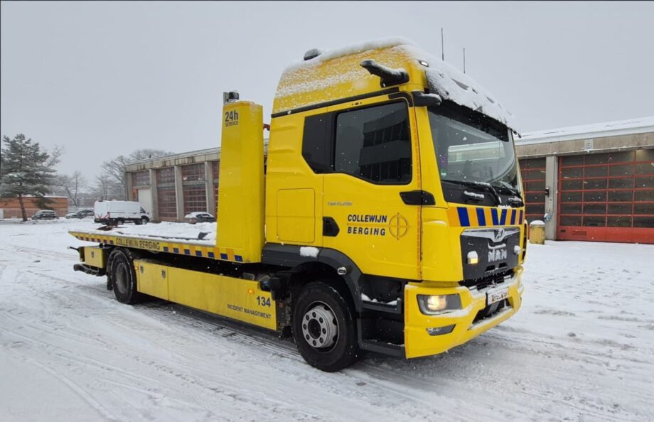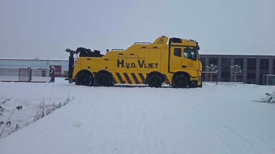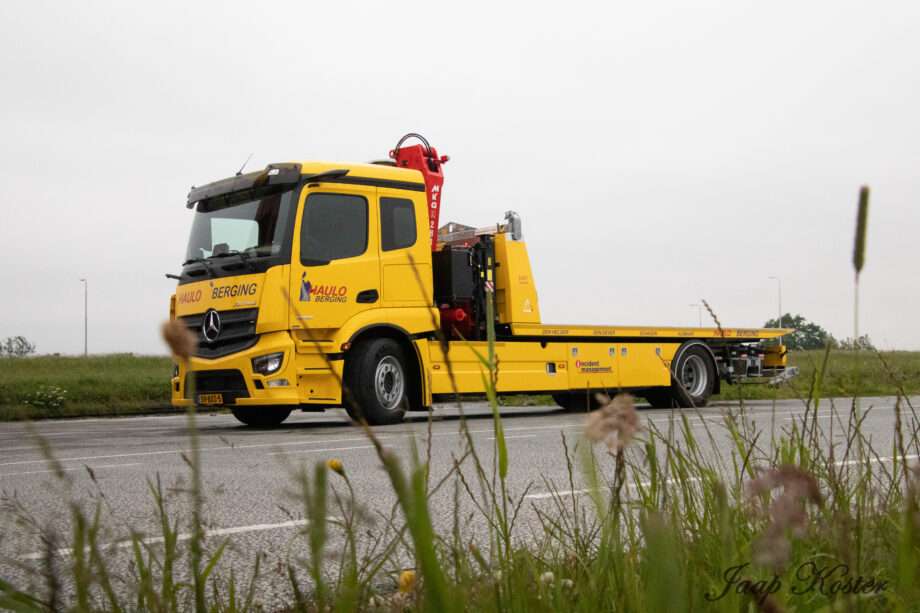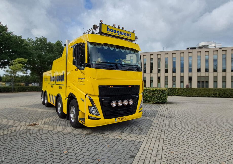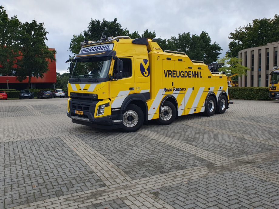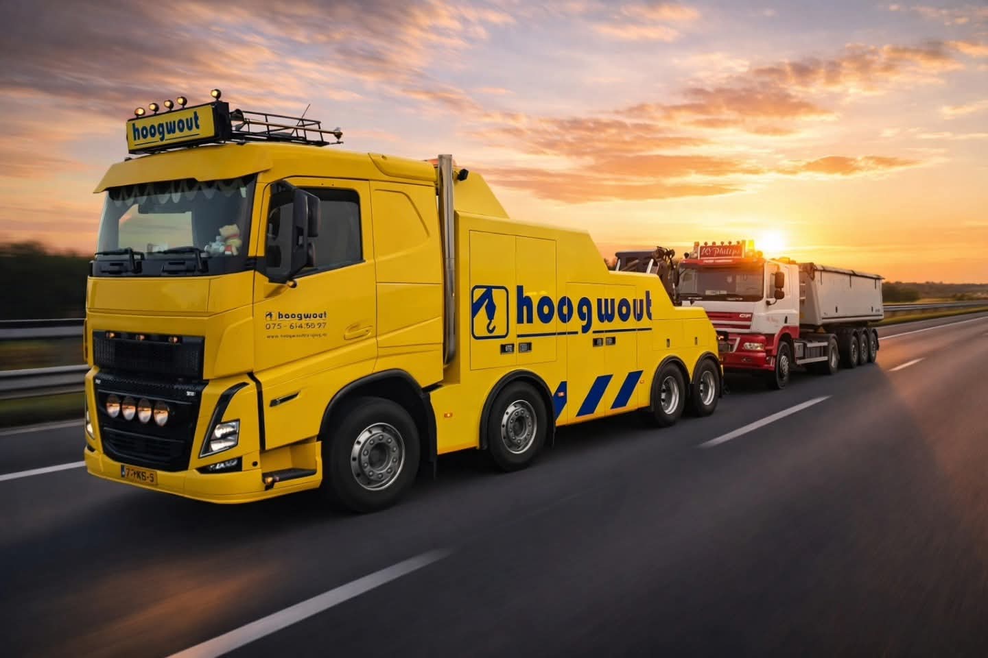 Vrachtwagen met pech wordt naar garage Scania gebracht door collewijn,,