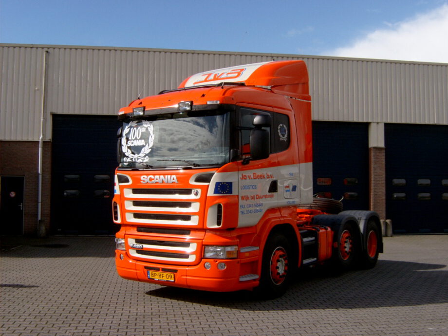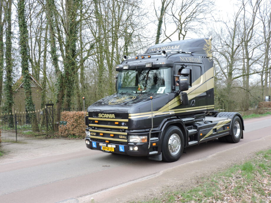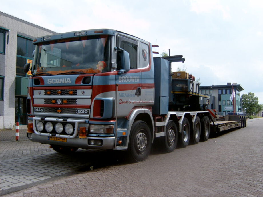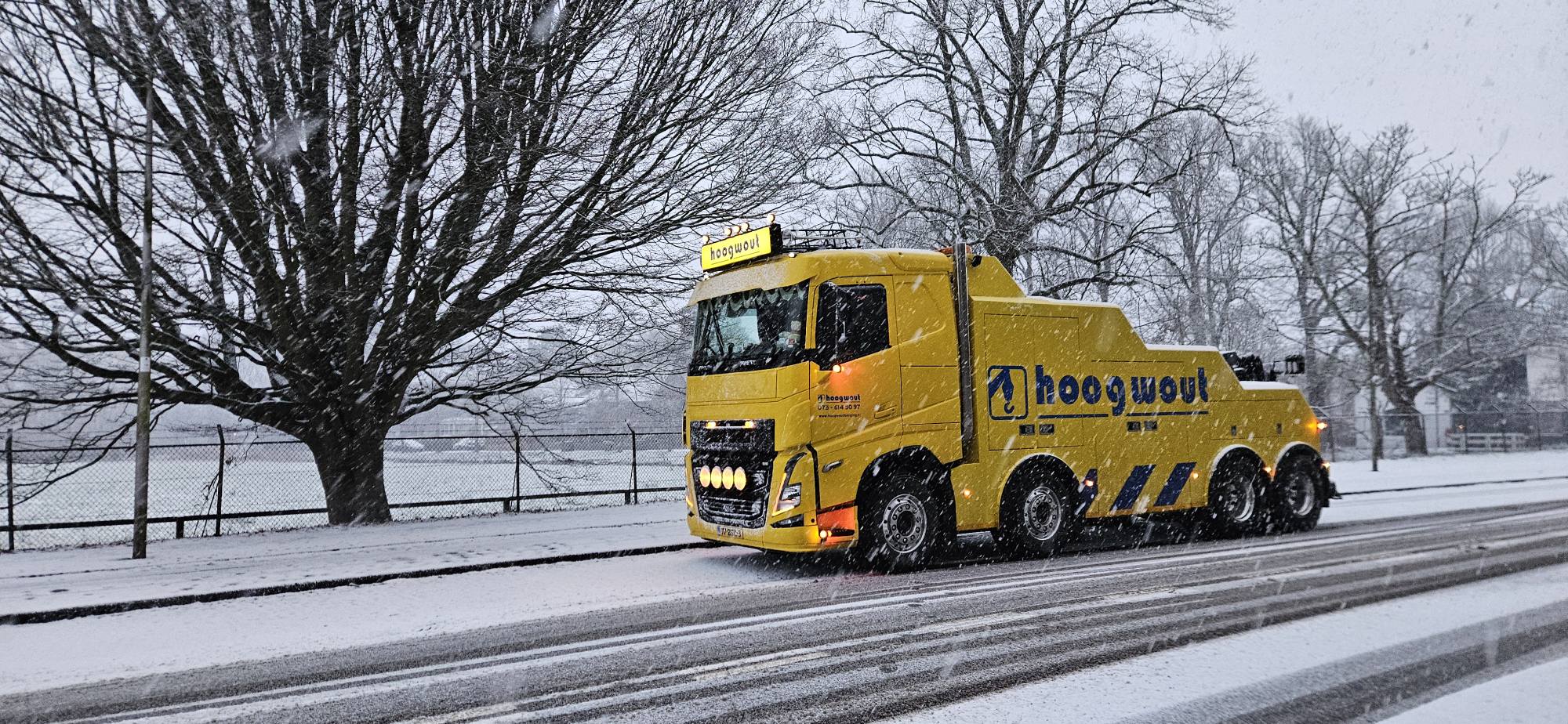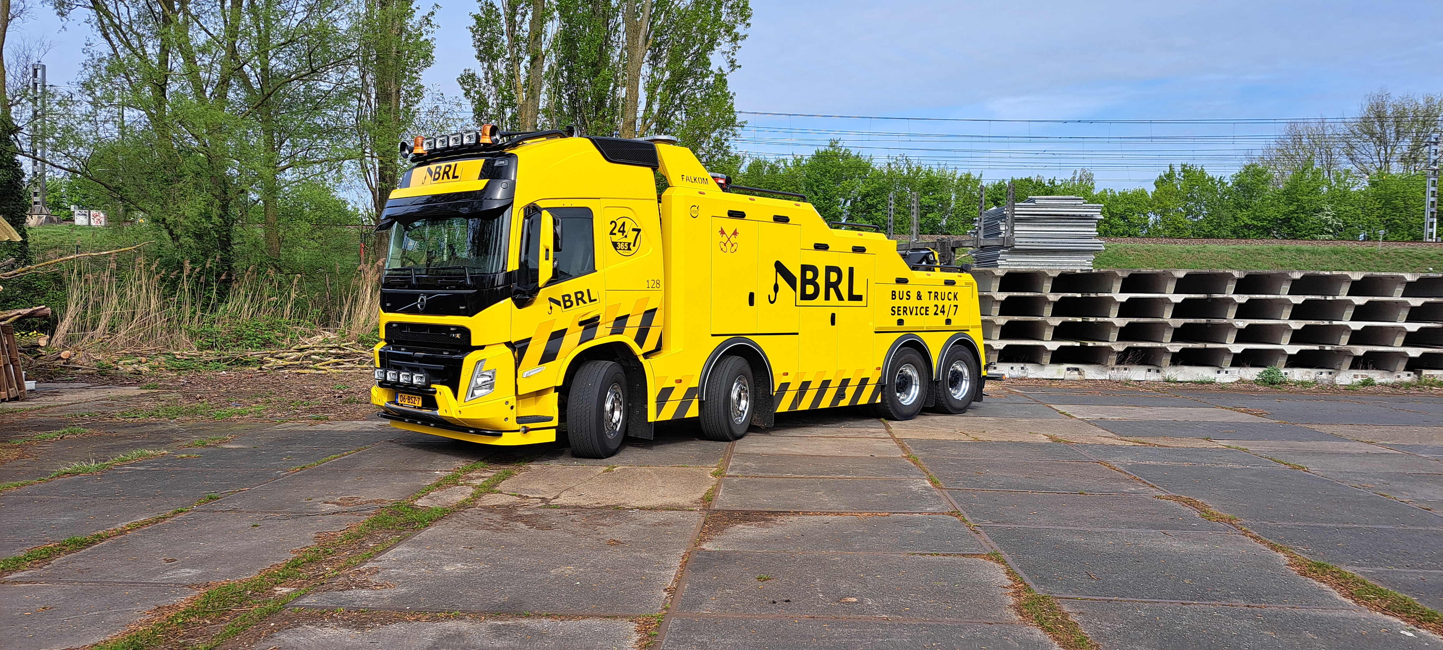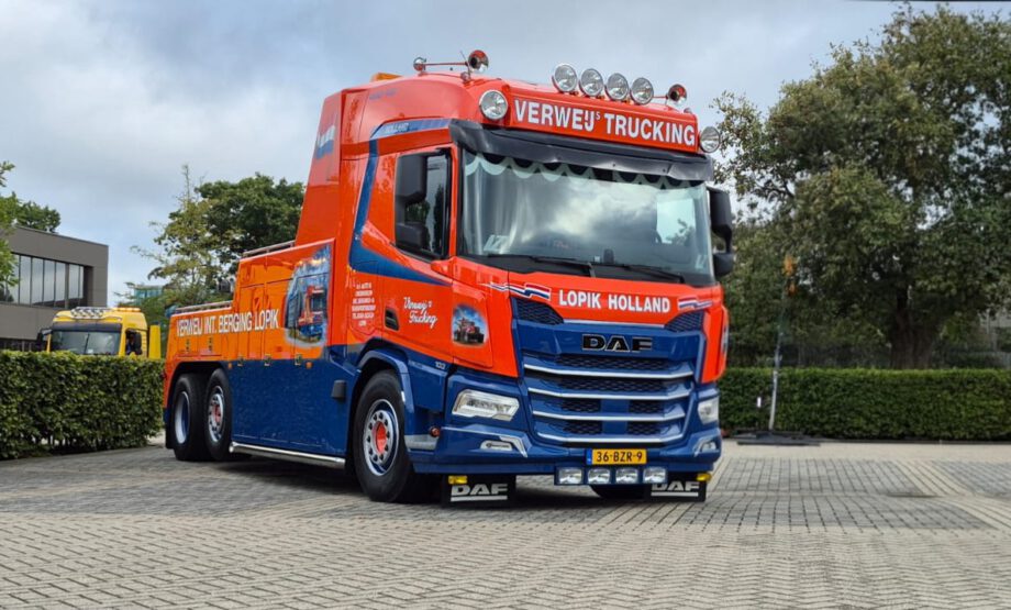 Vrachtwagen met pech wordt naar garage Scania gebracht door collewijn,,